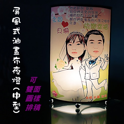客製化的油畫布彩印直立屏風式小夜燈,讓您的相片、畫作、攝影圖像、創作創意、Q版人像漫畫彩繪..等,化身為點亮室內的屏風式的居家藝術品,可增添溫馨、浪漫的氣氛。