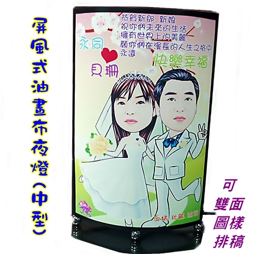 [簡介]:油畫布夜燈是特殊的客製化禮物,用美工設計成一幅油布畫作及屏風式造型照亮您我的心,送禮自用最佳的禮物